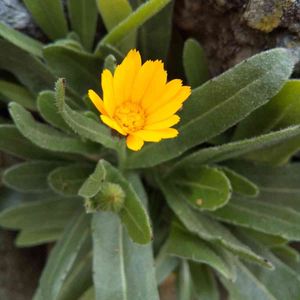 ヒメキンセンカ (姫金盞花) 別名:フユシラズ (冬知らず) 🌿キク科 キンセンカ属 *耐寒性があり真冬でも花を咲かせる *茎は4稜がありクモ毛と腺毛がある *花期は~10月(暖地ではほぼ通年) 寒くなり花も終わり地味なこの時期に、明るい橙黄色に引き寄せられます❣️ 花は12㎜位でした💛