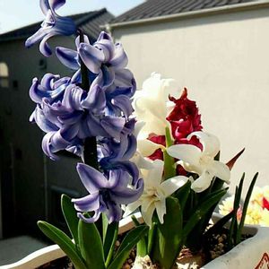 八重咲きのヒヤシンス 2年目 ボリュームなくなりましたが3色咲いてくれました😊 ブルーが一番元気です😉