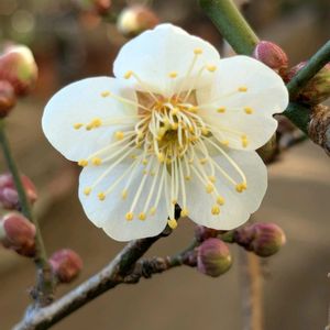 こんばんは😊🌉 盆栽の白梅が一輪咲いてきました🤍💞 夏場の猛暑でどうなるかな〜...と心配でしたが蕾も沢山あるのでこれからが楽しみです✨🎶🎶😄