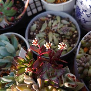 昨年、多肉植物の寄せ植えを初めてしたときのものです🌱 初心者の初心者による初心者なりの寄せ植え♡ 名前わからないけど白い花咲きました🤍 奥の黒法師は発根して伸びてきました🌱 黒法師だけ別に植え替えしようかな😌 ベテランの皆様でしたらどうされますか?