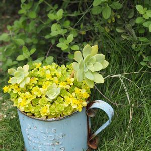 多肉植物寄せ植え 70 この春、黄金丸葉万年草の可愛さに気づき、カップに挿しました。 もりもりブーケになる予定💐