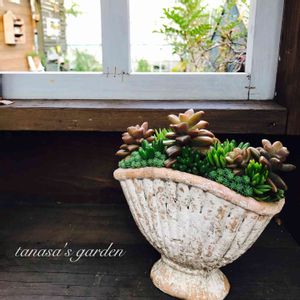 ご無沙汰の投稿ですf(^ー^; そろそろ…GS復活していきますよ😁 またよろしくお願いします🎵😊 今日は、papaが寄せ植えをしてみたいと言うので、寄せ植えレッスン✨ 初めて🔰のpapa寄せ😁笑 初めてのわりには、上手く出来たね❗と誉めると… 毎日私の寄せ植えを見て勉強してるからね❗まっ、こんなもんかな😁と…( ̄▽ ̄;)💦 しかも、この鉢は私が作った陶器鉢なんですが、ドラえもん鉢と言われました( ノД`)… 青くて丸い… 足も白で丸い… ってf(^_^; 確かに❗(*ノ∀`)ノ゙))アヒャヒャ