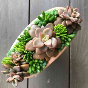 普及種ばかり寄せ٩(๑>∀<๑)۶ このまま壁に掛けられる❤ こんな寄せ植えも嫌いじゃない(*˙˘˙)♡ グリネとセダムがもっとモリモリになったら可愛いと思う😆⤴