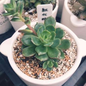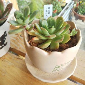 一昨年リサイクルショップで見つけた、昔ミスタードーナツ🍩の景品だったらしい卵型ミニ植木鉢。 樹脂ではなくて陶器です。 (ペア&受け皿付き&ピック2つで100円という超掘り出し物) 紅化粧、なんて粋なネーミングなんでしょう。 ✨🍀🥚🍳☘️🌿