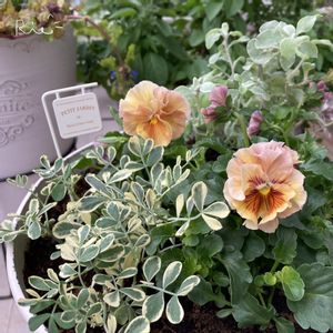 ジュエリーボックス風寄せ植えpicの反対から見た子😊 『フリル咲きパンジー シエルブリエ』 『ビオラ シフォンピーチ』Ueta どちらもとっても可愛いお色です( ˘͈ ᵕ ˘͈ )♡ ~今日この頃~ 今日の夜から朝にかけての雨は凄かったですね💦💦 塀の上にあるものを下ろして、玄関付近の寄せ植えは玄関内に入れておいたけど…薔薇さん放置してしまったよ😵💦 こんなに凄いとは…💦 まだちゃんと確認してないけど、ディスタントドラムスさん、頭重そうにしてたな😅 ビオラ&パンジーでスリットバスケットやりたいなぁ~と思っているけど…今のところ計画中なだけです🤩✨✨(*´³`*) 色んなの観て研究中~😉💓