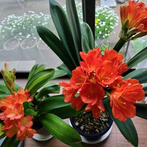 友人から3年前に頂いて3回目の開花の君子蘭(右側)と、息子が2年前に我が家に持ち込んで今年初めて咲いた君子蘭(左側)💕 どちらも花茎が2本。やっと揃い咲き🥳ちょっと色が違うかな🥰