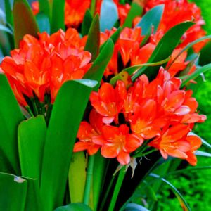 🍀🌻🪴💐🌹🌻🍀 🍀🧡クンシラン(君子蘭)🧡🍀 💐クンシラン(君子蘭)の 花言葉 は(誠実)・ (貴い)・ (情け深い) です 💐名前は【蘭】と付きますが、蘭の仲間で はなく、ヒガンバナ科・クンシラン属 の総称です 💐ヨーロッパでは(スカーレット・カファ ・リリー)と呼ばれいます 💐草丈は30~70cmほどで、3~5月頃にオ レンジ色の花が咲きます 💐長さ10cmのトランペット形をした橙色 から緋色の花びらが、いろいろな方向を 向いて(散形花序)咲くのが特徴です 🍀🏵️🌼🌸🌼🌺🍀