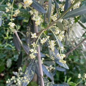 オリーブの花が咲いて 花粉が降ってます🤍🌿 もう一本の木の剪定時期をしくじって まだ、花が咲いてません😓 今年は実がならないかなぁ💦