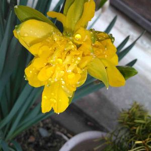 3/31 (木) 🌧 💚💛フォンシオン💛💚 八重咲き水仙 学名❀✿Double daffodils L.var.VonSion. 別名❀✿八重咲き水仙 花色💛黄色 ※ヒガンバナ科 ※スイセン属 ♣️花型:葉はニラに似ていて、散形花序の頭花に4~8輪ほど付け「外花被片(萼)3枚と内花被片(花弁)3枚」に、雄しべ・雌しべ・副花冠が花弁化した八重咲きの黄色い品種になっておる。♣️ 開花観察中〜📸📱💛💚