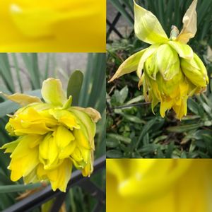 4/4 (月) 🌥 💚💛八重咲き水仙💛💚 💛フォンシオン💛 ※ヒガンバナ科 ※スイセン属 ♣️地中海沿岸地方原産の耐寒性球根植物。 古典的な園芸種スイセンで西洋では17世紀頃から園芸植物とされる。 昔から園芸植物として栽培された。現在、各地で野生化してる個体がしばしば見受けられる。 花期は4~5月。一茎に一花の八重咲き。花被も副花冠もばらばらに分かられていて区別がつかない。花のボリュームはあるが重さで花が傾き、かつ、ウィルスにより花被が緑色を帯びたものが多い。♣️ 4/4付、歩道脇にて経過観察👀📸📱💚💛