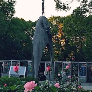 平和公園の 原爆の子の像 の側にある小さなバラ園は、平和を願って世界各国から贈られたバラが植えられています🌹🌹🌹 紅葉を眺めながら園内を歩き回って、辿り着いた時はもう辺りは薄暗くなっていて、折り鶴を捧げ持つ少女の像がシルエットになって浮かび上がっていました。 広島平和記念公園