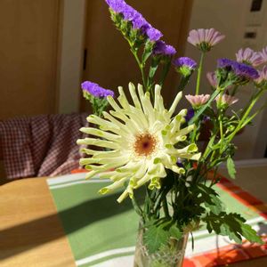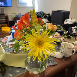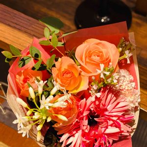 コロナも落ち着き、実母の誕生日に兄弟姉妹とその家族でお食事会🥰 当日の洋服と花束をプレゼント🎁 いつものお花屋さんに、、お任せでお願いしました。華やかで、とってもステキな花束で、見惚れちゃいました💖💜💚💛💙