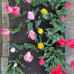 4/9 チューリップ🌷昨日の強風と雨で、少し傾きましたが、今が一番カラフルで綺麗です。