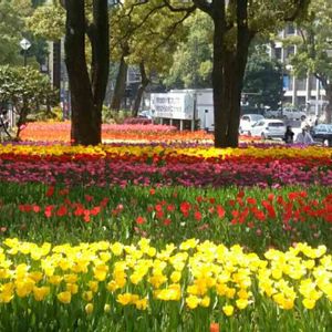 4月の山下公園より どこかの素敵なモデルさん お帽子の雰囲気が この景色にピッタリでした✨ 綺麗な花壇に氷川丸 本当に山下公園って素敵です。