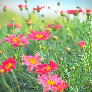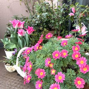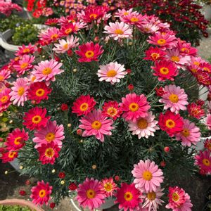 マーガレット シンプリーコーラル ようやく開花したと思ったら一気に咲いた 冬越しして昨年のお迎え時より大きくなりました 咲き始めは濃いピンク🩷 花色変化のタイプなのでこれからが楽しみ😊