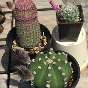 つぼみたち🤗 左奥:紫太陽 右奥:マミラリア ブーリー(桜富士) 手前:刺無し短毛丸