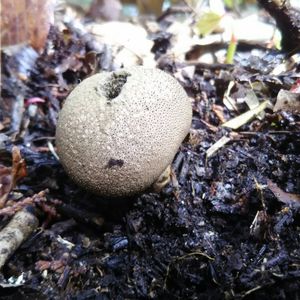 ホコリタケ? それともタヌキノチャブクロ? 幼菌は固いですが、穴が開いているのをパフパフすると、中から胞子が飛び散りました。