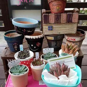 おはようございます❣️ 夜中から、何度も目を覚ますほどのどしゃ降り💦 朝起きてからも、バケツをひっくり返したような雨が…😱 お仕事なので、ややテンションダウン(笑) 昨日は急に旦那さんの思いつきで、隣町でやっていたヨルタノシイトヲカシというイベント覗いてきました✌ 15時〜21時までのイベント🎪 38botanicのhacchiさんが出展されていました❤ 仕事終わりだし、長女が塾から帰ってきてからだったので、作品もあまり残っていませんでしたが、いつものhacchiさんの笑顔に会えて嬉しかったです❤ 真ん中のおっきいカフェ鉢ゲットしてきました。 ☆☆☆☆ 今日、明日は岐阜でBABBIちゃんの35マルシェ❤ 右のフルールブラン、BABBIちゃんから購入した韓国苗です❤ こんなステキな苗もあります❣️❣️❣️ お近くの方は足を運んでくださいね😊 カワイイビーズはちるちゃんから頂きました😊 長女にお守り❤と招き猫ちゃん❤ ガーデニンググッズも! 器用でステキだな❤ ちるちゃん、美味しいお菓子や苗もありがとう♫ 左の鉢!!! 最近迷走中のリメ鉢作り💦 画伯のワタシが手描きをするとこーなる😭😭😭 線・動物のカバさんです😁 旦那さんがチビげんに描いてあげていた絵を真似しました。 これはヒドイよねぇ(笑)