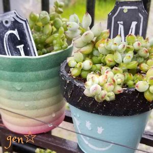 おはようございます❣️ 今週はずっと曇り空💦時折雨☔も…。 今朝はこの子に目が止まりました😁 雨に輝くペンデンス❣️ 多肉ちゃんを始めてすぐに買った子です😆 もう何年もたち、ダメかと諦めるほど減ったり。 でも、今はモリモリ❤ 奥の鉢に分けた子もモリモリ❤ まだ見たことないお花、いつか咲くといいなー➰ MとGのプレートはラルちゃんにいただきました❣️❣️❣️ ありがとー(´︶`♡)♪ 私と旦那さんの初期も初期に作った恥ずかしいリメ鉢も、プレートのおかげでちょっとは素敵に見えるかなー💨