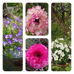 ラナンキュラス、まだまだ綺麗です。 穴の空いたじょうろに収まったロベリア。 アレナリアは、ワイヤーで吊るしてみました😅