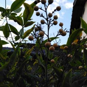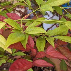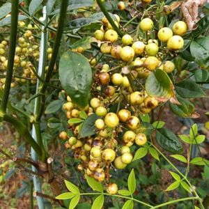 鳥さんが置いていったナンテン。 一本ヒョロっと出ているのに気づいてから3年以上経ったかな? 根元から分枝して大きな株になってきた。 白南天って、常緑だってこれで初めて知りました。 庭に元々ある南天は、赤い実で紅葉してます。