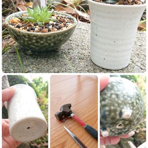 ずっとやってみたかったこと① ん~なかなかいい鉢に巡り会わんなー🤨 あっ!これいい!と思っても穴が無かったりして断念🧟♀️ なので以前から、穴あけたい願望が増すばかり🧠 電動ドリルでは女子な私にはハードルが高いし、ドリルの使い方、種類もよくわからないしで🤮オエッ 第一‼️せっかちなんで🏊 と言う訳で、コスト(色んなコスト含まれてます)的に… 穴あけポンチ~🔨✨ んで、やってみた✨今回は試しに100均で購入したお猪口と小鉢でガツガツやったら一分くらいで開いたぜ‼️ヤッホーイ💃 スッキリしましたーーー‼️