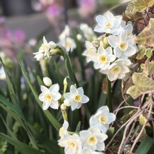 こんにちは♪(๑ᴖ◡ᴖ๑)♪♡ 今日の2枚目は可愛い白いお花さんたちですo(^▽^)o♡♡♡ 🏷️ 白い貴婦人✨ 🏷️ 白い水曜日♡ ◎ 八重咲きスイセン 豪華な八重咲きの水仙です。 ホワイトにアイボリーピンクの花色がキレイな品種です。 学名:Narcissus タイプ:ヒガンバナ科スイセン属 原産地:地中海沿岸 開花時期:4月頃 草丈:30〜40cm 【育て方】 ■日当たり・置き場所 日当たりは少々の日陰なら平気です。 真夏以外は日当たりの良い所に植えてください。 耐寒性は-25℃までなので屋外で越冬出来ます。 植え付け時期は植え込むのが早過ぎると葉ばかり茂り、遅過ぎると開花が遅れます。11月が適期です。 酸性土をやや嫌うので植え込み時は苦土石灰を施してください。 堆肥も極少量混ぜると良いです。深さ5cm程度で植えつけます。 ■管理 チューリップと同様に、花を咲かせるには、冬の寒さに当てる必要があります。 花が咲き終わったら 萎んだ花は早めに切り取ります。 球根に栄養を蓄えるために、葉が枯れるまで切り取らないでください。 数年は植えっぱなしでもよいですが、堀りあげる場合は葉が枯れた6月頃にして、休ませてから秋に改めて植えます。 小さく分球した球根は、分けて植えると2、3年後にまた花を咲かせてくれますね🩷 ■水やり 土が乾いたらたっぷりと水やりします。 ■肥料 花後、葉が枯れる迄は、液肥を月1〜2回が目安です。 芽が出た頃、あげ過ぎると花が付き難くなるので、花後のみ肥料をあげた方がよいそうですo(^▽^)o♡ ■植え替え 2〜3年は放置しておいて平気ですが、葉が伸び過ぎたら6月に掘り下げてベンレートで消毒して休ませてから改めて植えると良いそうですo(^▽^)o♡♡♡