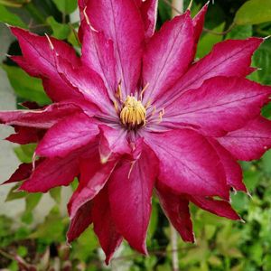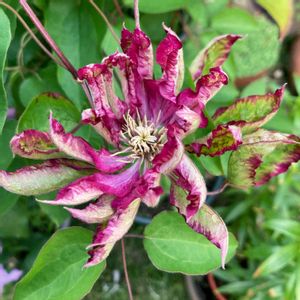 クレマチス/花炎(かえん) こちらは我が家の赤色ゾーンのクレマチス❣️ 八重咲きの個性的なクレマチスです♪ 気温によって花色が赤一色になったり緑が混じったりします。 今はこんな感じで咲いています🤗