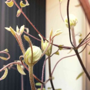 クレマチス・花炎 まだ口は固いか⁉️ うーん🤔 まだまだかな❓ 🌿の色は茶色から緑に、普通になってきた。