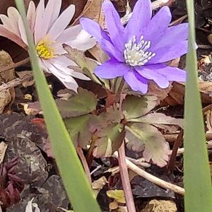 続き 同じ場所(3/10) 「キクザキイチゲ♡」😍一輪だけが 何故ここに?と言う感じで淡いピンク色したユキワリイチゲ♡」の隣で咲いてました💜 葉は菊の葉っぽく 蕊は白色なんですね! 「ユキワリイチゲ♡」の群生咲く中 めだってました😄 其にしても可愛らしさがたまらないです💗