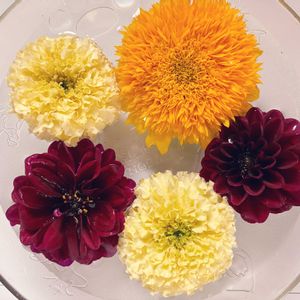 おはようございます😊☀️ 今朝は色々と咲いていたお花を水に浮かべてみました🥰 ミニひまわり、アフリカンマリーゴールド、ダリア︎💕︎︎ 来年はもっと大きな鉢にしようかな✨️︎💕︎︎