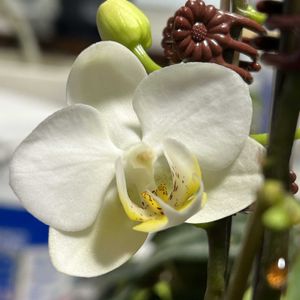 やった⤴️🙌😆 何年越し?7?8年?もう忘れてしまうくらい全くお花が咲かなかったミニ胡蝶蘭の花が咲いたー🎉逆にどうして咲いたの?普段と変わらないお世話しかしてないのに😳うれぴぃ🎵