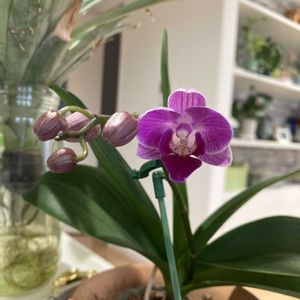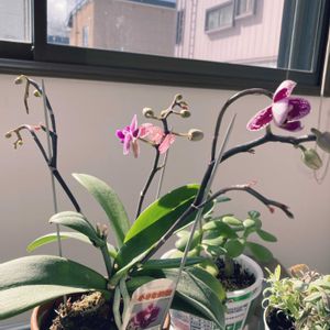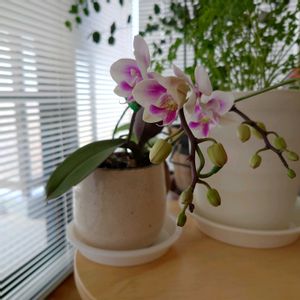 こんにちは😃 今日はポカポカ春日和🌸 今年もミニ胡蝶蘭 ドリテノプシス チア イー イェンリン咲いてくれました🥰 3本立てだけど、同じ向きじゃないのが残念💦 でも、蕾もたくさん付けてくれて嬉しい😃ありがとう🩷