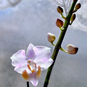 ウチの寝坊助ミニ胡蝶蘭 他の3つのミニ胡蝶蘭が 5月末に咲き始めたのに 1人だけ眠り続けた眠り姫〜🩷🩷 4つ目の胡蝶蘭が 無事,開花しました。 他のミニ胡蝶蘭が萎んでしまった 今になってちょうど入れ替わり〜🤗 淡い淡い藤色のお花です。 眩しすぎる真夏の陽光に透けて とっても綺麗です。