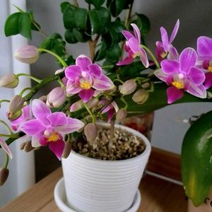 おはようございます。 今朝は朝から雨☔️です。気温19℃。 我が家で育てているミニ胡蝶蘭さん。 5年前に廃棄寸前の株を迎え入れた胡蝶蘭、昨年咲き終わり切り戻した茎の直ぐ下から花芽茎が成長し、花蕾落ちることなく、昨日一輪開花、咲きました。開花含め蕾数が九個です。 5年続けて咲いてくれました。 😅 そのpℹ︎cを投稿させて頂きます。 😊 今日もよろしくお願いします。🙇 今日でゴールデンウィーク終わりですね。楽しい一日を、そして、ご自愛下さい。
