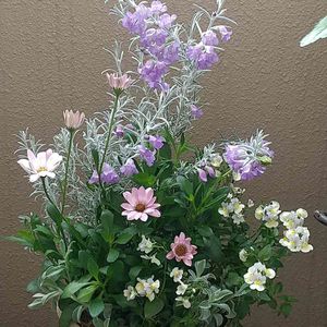 シレネユニフローラの横に オステオスペルマムを入れて 少し爽やかさをプラスしてみました💜💙 エレモフィラニベア ヘリクリサムペティオラン コピアもはいってます ワイヤープランツの勢いが良く 鉢が隠れそうです