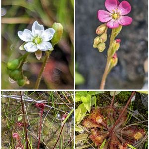 おはようございます😊 ☁️空です、夜から明日はまた☂️の予報、被害が出ない事を願ってます。 今日は地味に可愛い花😆 ちっちゃくて見えなーいと言われそうですがこれ以上にすると画像がひどくなるのでご勘弁を。 森林公園の湿地には何種類かの食虫植物が住まってて、 可愛い花を見せてくれます。 上段の白い花がモウセンゴケ(毛氈苔)葉は右上↗️ 下段のピンクの花はトウカイコモウセンゴケ(東海小毛氈苔)東海から近畿にかけて咲くモウセンゴケの仲間です 葉は左中段 どちらもモウセンゴケ科で湿地に自生し葉っぱの表面に腺毛と呼ばれる毛がびっしりと生えています。この部分で虫を捕らえるので、捕虫葉とも呼ばれます。腺毛は通常赤く、その姿が緋毛氈のように見えるところから、この名前があります。コケとつきますがコケの仲間ではなく、種子植物です。主な開花期は初夏~夏で、花茎を伸ばして5枚の花びらを持つ小さな花を順番に咲かせます。 花ちゃんの🏷️自然は面白い 🏷️植物マジック 参加させていただきます😊 2023.6.8森林公園の湿地で撮影