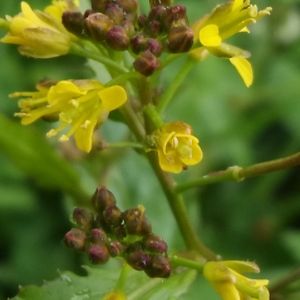 透かし田牛蒡 スカシタゴボウ アブラナ科 イヌガラシ属 分布 日本全土 在来種 花 期 4~10月 葉 深裂、浅裂する 花 直径2.5~3㎜の黄色十字形花。萼片4、雄しべ6、雌しべ1。 果実 幅2~2.5㎜、長さ4~5㎜と短い。 果柄の長さ 果実の長さとほぼ同じ。熟すと果皮が裂け、種子を出す。花序の下側に白色の果実の隔壁だけが残っているのがよく見られる。 スカシタゴボウのような果実は長さが幅の3倍以内であり短角果と呼ばれる。 よく似たイヌガラシは果実が長さ1.6~2㎝と細長く、長角果であり、果柄は果実より明らかに短く、葉の切れ込みが浅い。 ヒメイヌガラシはスカシタゴボウとイヌガラシの雑種で果実が完熟せず、種子ができない。