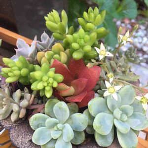 セダム箱、みんなこんもり~っと、始めと比べてめっちゃ成長した! テキトーにチョンチョロ~と植えたハオルチア、ピーチネックレスの切れ端、火祭り(子供が拾ってきたやつ)が、びくともしないくらいに根付いててビックリ!! やぱ植物すご! 私はつわりでぶっ倒れ中です~ 全然植え替えできてないのーー…どうしよ~😭💦💦