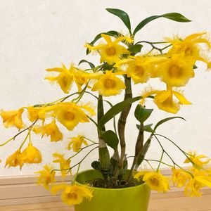 今日の花 デンドロビューム 💕 今年はまだ花芽出たばっかりで咲いてないので去年の4月の写真です♫ 2019年の2月に世界らん展でワカヤマオーキッドさんから買いました ミニサイズのバルブにひよこみたいなもふもふのお花がすずなりに咲いてほんとにかわいいんです🥰 大好きでとっても大事にしてるのに2019年2020年ともなぜか新芽が伸びずどうなってしまうのか心配してたのですが、今年は新バルブが元気に2本成長してくれました😆💕 春にはまた黄色のもふもふちゃんがたくさん咲いてくれるかな〜☺️
