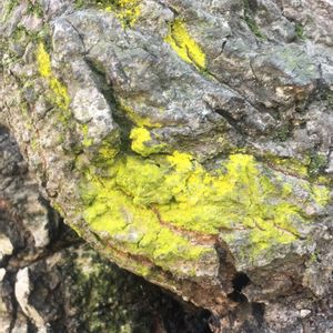 誰かがイタズラで絵の具をぶちまけたような鮮やかな黄色💛 はじめ見た時はビックリしました‼️ コレも地衣類の一種です😍 地衣類の分類は最終的には、成分を化学分析しなければならないようですが、私には無理ですので、暫定的にコガネゴケとします💛