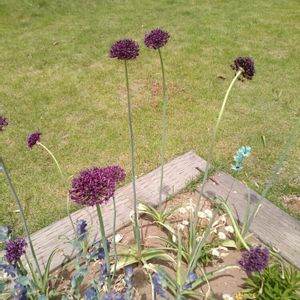 無事に咲きました✨50センチくらいはあるかな? 丸くはならないアリウムで画像の通り赤紫色です😍