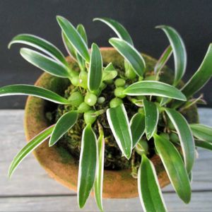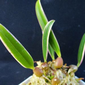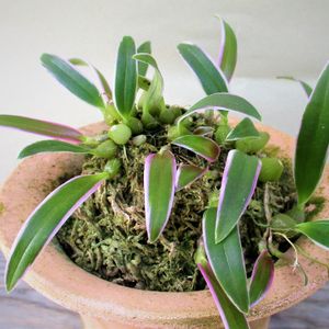ミヤマムギラン 細葉の曙 高知県産 いよいよ本格的に寒蘭の開花を迎えて高知県では展示会一杯です☺️でも寒蘭買わずに日曜市でミヤマムギランの新品種購入しました😆すごく安かったです✨💕しかも野生の斑入り😊