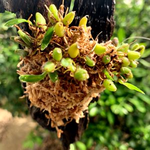 オリーブ周辺の植物達🌸🍃🌼。6月12日撮影📸。 屋外越冬(軒下)のデンドロビウムに花芽がΣ(・ω・ノ)ノ!とっても嬉しいです😊。他の着生ランの皆様も元気一杯で一安心。 滲み壺の中にはカエル🐸さんも住み着いてます💦。