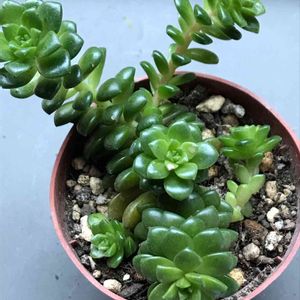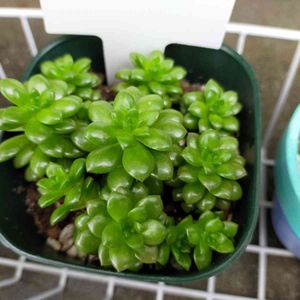 名前を教えて下さい🙏‼️ 職場タニ友に貰った子🍀 セダムかなぁ🤔 ツヤツヤしていて、レティジアの小さいのみたいな感じ‼️ 結構増える子で、黄色い花🌼が咲くらしいです❣️ 追記:poppyさんとひとみさんに 「リトルジェム」と回答頂きました❣️ ありがとうございました😊
