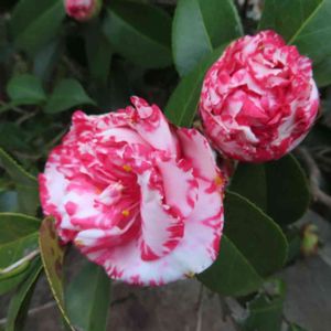 「珍しい柄の椿」 散策路沿いの畑、白地に赤が混ざった珍しい柄の椿が咲いていました。 あんころもちさんが太神楽(だいかぐら)と教えてくださいました。 撮影日 2021.2.9 以下、メモです。 太神楽(だいかぐら)という椿はいわゆる「江戸椿」と呼ばれるもので、江戸時代に日本で生まれ今でも名花として人々を魅了する古典品種。紅色地に白斑が入り、牡丹咲きから獅子咲きの華やかな花容をした大輪の花。赤地が勝るか白斑が勝るかは様々。