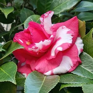 おはようございます😃 群馬県に帰省しても、椿に目が行きます。 美しい大輪の椿を見つけました。 太神楽でしょうか。🤔 獅子咲き、紅白の花びらが豪華な花です。