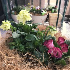 ラナンキュラス✲︎アネモネ 私の憧れ・2TOPの寄せ植え♡ 真ん中はコロニラバレンティナバリエガータ。 斑入りの葉っぱで黄色の小花。 花言葉は「不老長寿・上品」とのこと♪