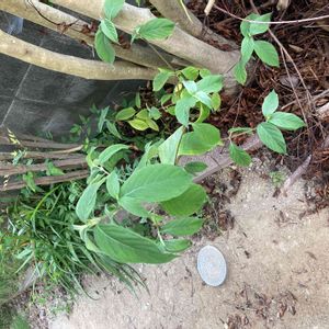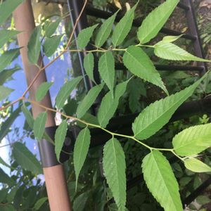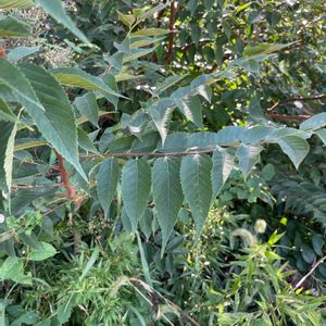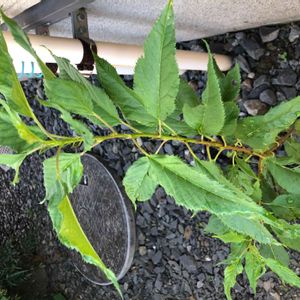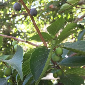 ほらほらここにも秋が来てる〜☺️🟣🟣✨ うちの通路に、枝張りがとても長ーーーーいムクノキが2本ある。写真に写ってる葉、全て一本の木のものである✨ 先日の台風で甘くなった実が大分落ちてしまったけれど、なんせ大きな木なので、まだまだ甘い実があるから食べに来てね、小鳥さん🙋🏻♀️💕 2022・9・6📷