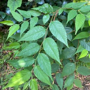 ムクノキ(椋木) アサ科ムクノキ属 葉の基部から3本の脈が伸びる。 側脈は縁の鋸歯まで達する。 葉の表裏ともざらつく。